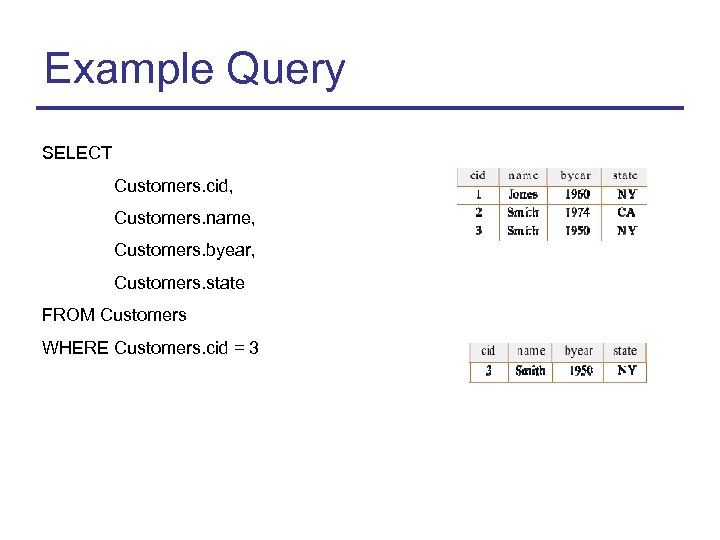 Example Query SELECT Customers. cid, Customers. name, Customers. byear, Customers. state FROM Customers WHERE Customers. cid = 3