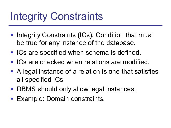 Integrity Constraints § Integrity Constraints (ICs): Condition that must be true for any instance of the database. § ICs are specified when schema is defined. § ICs are checked when relations are modified. § A legal instance of a relation is one that satisfies all specified ICs. § DBMS should only allow legal instances. § Example: Domain constraints.