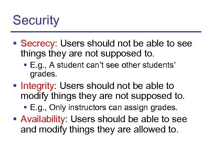 Security § Secrecy: Users should not be able to see things they are not supposed to. § E. g. , A student can’t see other students’ grades. § Integrity: Users should not be able to modify things they are not supposed to. § E. g. , Only instructors can assign grades. § Availability: Users should be able to see and modify things they are allowed to.