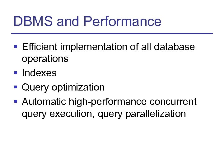 DBMS and Performance § Efficient implementation of all database operations § Indexes § Query optimization § Automatic high-performance concurrent query execution, query parallelization