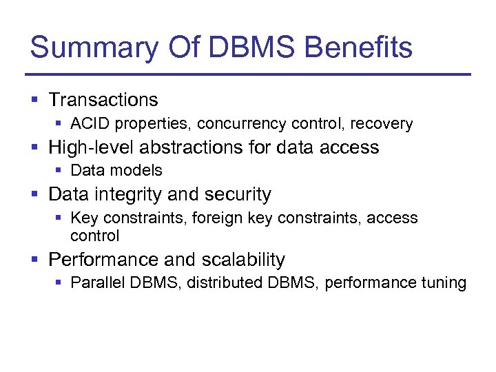 Summary Of DBMS Benefits § Transactions § ACID properties, concurrency control, recovery § High-level abstractions for data access § Data models § Data integrity and security § Key constraints, foreign key constraints, access control § Performance and scalability § Parallel DBMS, distributed DBMS, performance tuning
