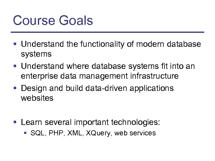 Course Goals § Understand the functionality of modern database systems § Understand where database systems fit into an enterprise data management infrastructure § Design and build data-driven applications websites § Learn several important technologies: § SQL, PHP, XML, XQuery, web services