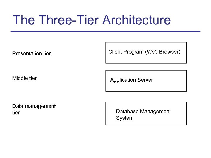 The Three-Tier Architecture Presentation tier Middle tier Data management tier Client Program (Web Browser) Application Server Database Management System