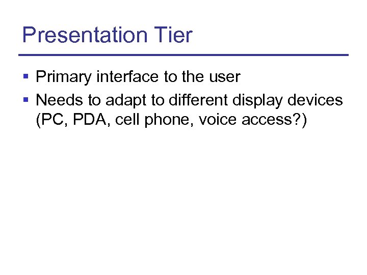 Presentation Tier § Primary interface to the user § Needs to adapt to different display devices (PC, PDA, cell phone, voice access? )