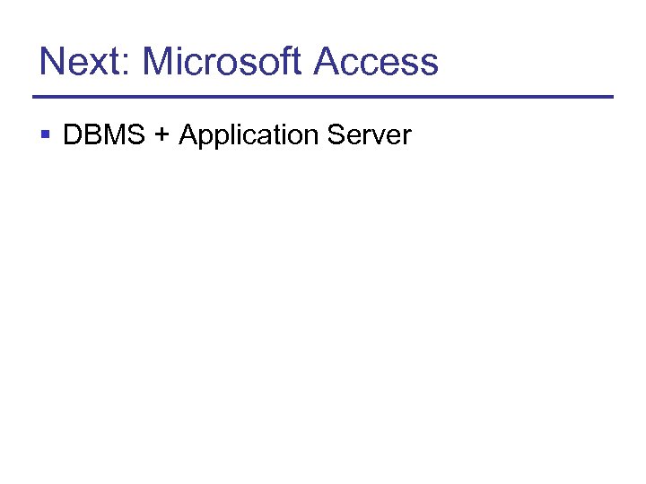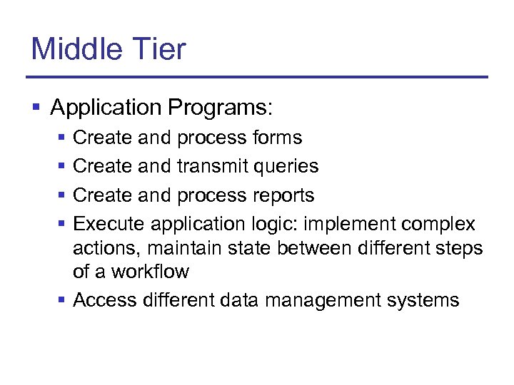 Middle Tier § Application Programs: § § Create and process forms Create and transmit queries Create and process reports Execute application logic: implement complex actions, maintain state between different steps of a workflow § Access different data management systems