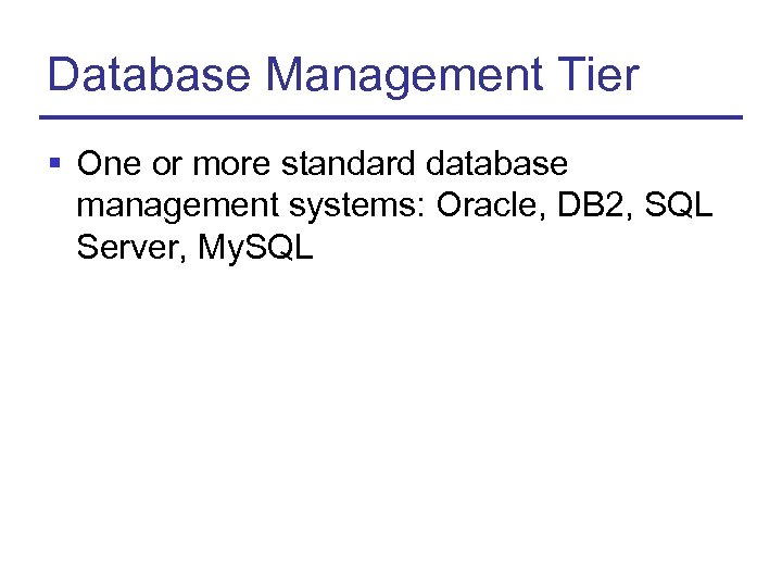 Database Management Tier § One or more standard database management systems: Oracle, DB 2, SQL Server, My. SQL
