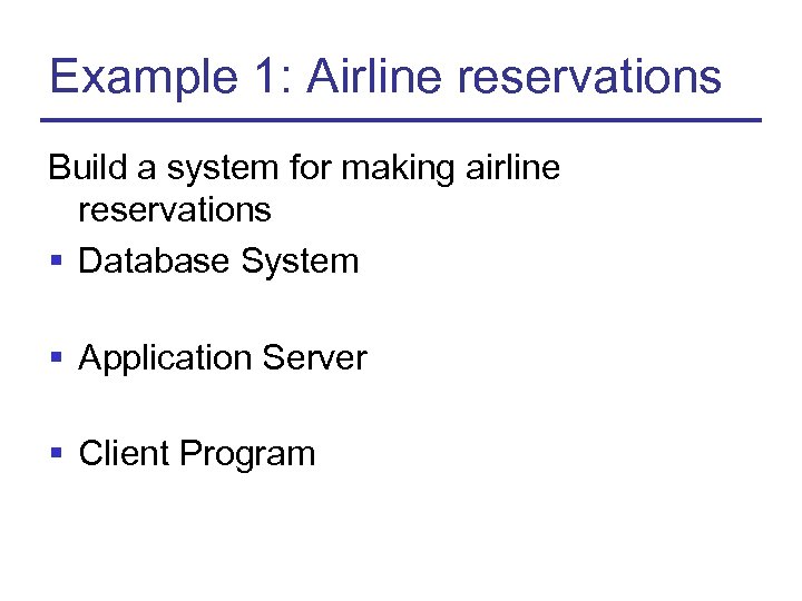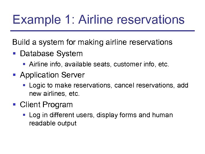 Example 1: Airline reservations Build a system for making airline reservations § Database System § Airline info, available seats, customer info, etc. § Application Server § Logic to make reservations, cancel reservations, add new airlines, etc. § Client Program § Log in different users, display forms and human readable output