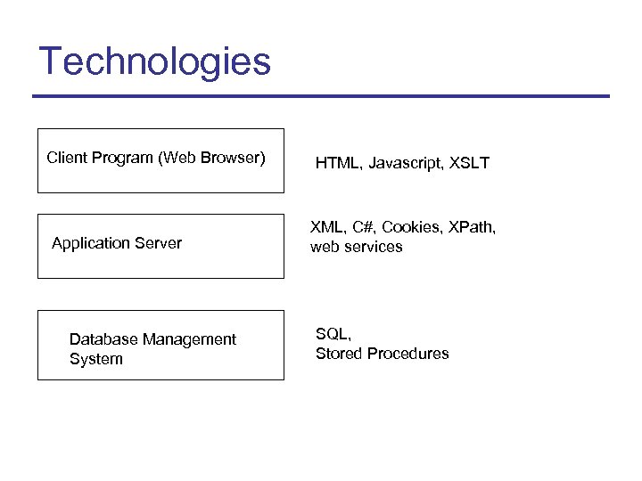 Technologies Client Program (Web Browser) Application Server Database Management System HTML, Javascript, XSLT XML, C#, Cookies, XPath, web services SQL, Stored Procedures