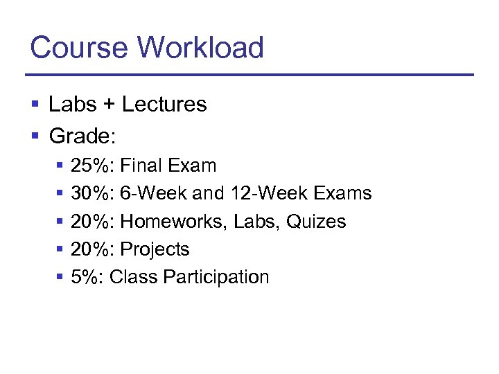 Course Workload § Labs + Lectures § Grade: § § § 25%: Final Exam 30%: 6 -Week and 12 -Week Exams 20%: Homeworks, Labs, Quizes 20%: Projects 5%: Class Participation