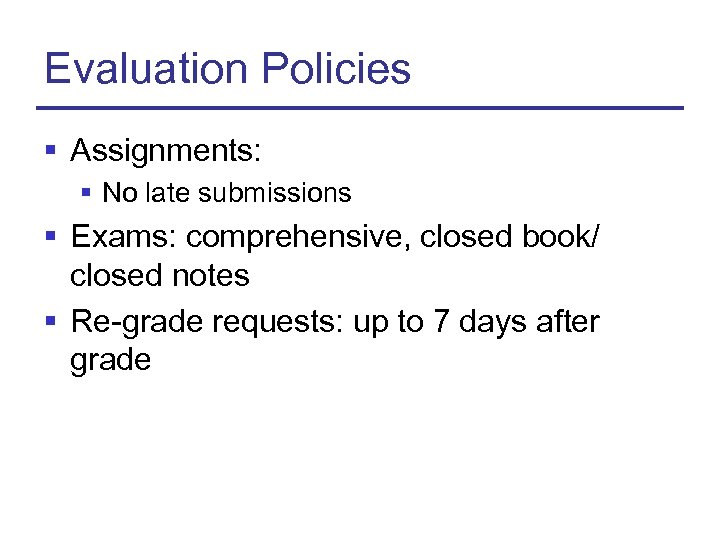 Evaluation Policies § Assignments: § No late submissions § Exams: comprehensive, closed book/ closed notes § Re-grade requests: up to 7 days after grade