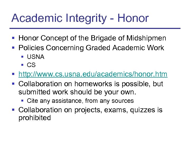 Academic Integrity - Honor § Honor Concept of the Brigade of Midshipmen § Policies Concerning Graded Academic Work § USNA § CS § http: //www. cs. usna. edu/academics/honor. htm § Collaboration on homeworks is possible, but submitted work should be your own. § Cite any assistance, from any sources § Collaboration on projects, exams, quizzes is prohibited