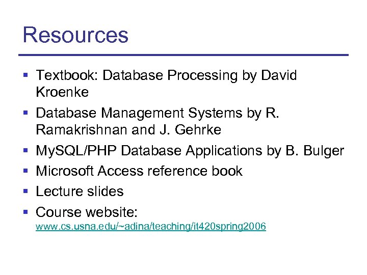 Resources § Textbook: Database Processing by David Kroenke § Database Management Systems by R. Ramakrishnan and J. Gehrke § My. SQL/PHP Database Applications by B. Bulger § Microsoft Access reference book § Lecture slides § Course website: www. cs. usna. edu/~adina/teaching/it 420 spring 2006