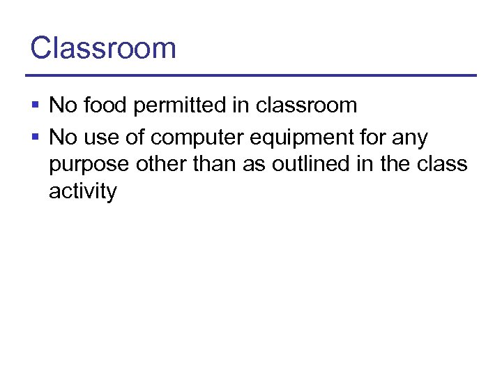 Classroom § No food permitted in classroom § No use of computer equipment for any purpose other than as outlined in the class activity