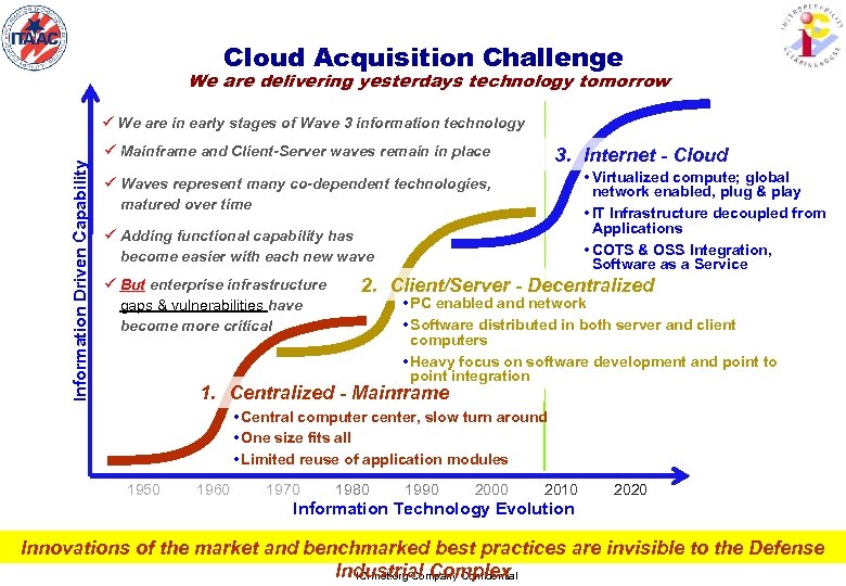 IT-AAC Capabilities Accelerate Success leveraging what works 1. Non-profit free think tank composed of the worlds most respected public service institutes and domain experts not available through traditional contracting mechanisms 2. Innovation Clearinghouse and Knowledge Exchange that captures proven market innovations in an acquisition ready context (canonical form) 3. Benchmarked Best Practices and Lessons Learned (SOA, Cloud, Iaa. S, Paa. S, Saa. S, Web Services) provided by customers who share business value from real world implementation and testing results 4. Acquisition Decision Framework that pools and normalizes infrastructure requirements, architectures, tech assessments, performance metrics (SLAs) business case analysis, and evaluation criteria. 5. Leadership Roundtables and Educational Forums that provides a hype free interchange with government and industry leaders 6. Virtual Solution Architecture Integration Lab (SAIL) and Solution Architecture Working Groups (SAWG), that detail realm of the possible and pre-validate fit and finish of commercial solutions. 7. Acquisition Advisory Contract Vehicles that reduce time to market and accelerate acquisition outcomes "It is not a great mystery what needs to change, what it takes is the political will and willingness, as Eisenhower possessed, to make hard choices -- choices that will displease powerful people both inside the Pentagon and out” Defense Secretary Robert Gates ICHnet. org Company Confidential