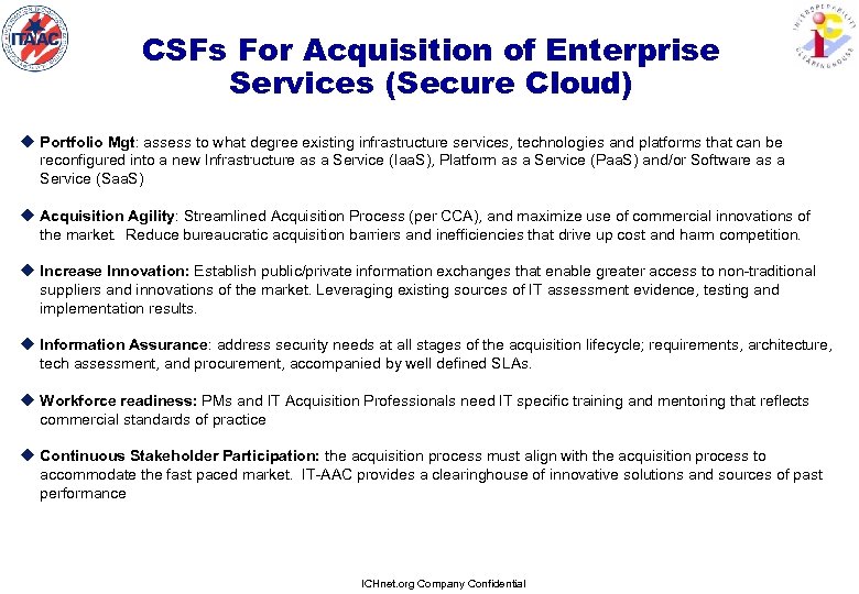 CSFs For Acquisition of Enterprise Services (Secure Cloud) u Portfolio Mgt: assess to what degree existing infrastructure services, technologies and platforms that can be reconfigured into a new Infrastructure as a Service (Iaa. S), Platform as a Service (Paa. S) and/or Software as a Service (Saa. S) u Acquisition Agility: Streamlined Acquisition Process (per CCA), and maximize use of commercial innovations of the market. Reduce bureaucratic acquisition barriers and inefficiencies that drive up cost and harm competition. u Increase Innovation: Establish public/private information exchanges that enable greater access to non-traditional suppliers and innovations of the market. Leveraging existing sources of IT assessment evidence, testing and implementation results. u Information Assurance: address security needs at all stages of the acquisition lifecycle; requirements, architecture, tech assessment, and procurement, accompanied by well defined SLAs. u Workforce readiness: PMs and IT Acquisition Professionals need IT specific training and mentoring that reflects commercial standards of practice u Continuous Stakeholder Participation: the acquisition process must align with the acquisition process to accommodate the fast paced market. IT-AAC provides a clearinghouse of innovative solutions and sources of past performance ICHnet. org Company Confidential