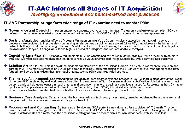 IT-AAC Informs all Stages of IT Acquisition leveraging innovations and benchmarked best practices IT-AAC Partnership brings forth wide range of IT expertise need to mentor PMs: u Governance and Oversight: how an enterprise supports, oversees and manages IT programs and on-going portfolio. SOA as defined in the commercial market is governance tool not technology. Do. D 5000 and BCL represent the current approaches. u Decision Analytics: enables effective Program Management and Value Stream Analysis execution. As most of these sub- processes are designed to improve decision making, a relative new discipline has evolved (since 86), that addresses the human and cultural challenges in decision making. Decision Analytics is the discipline of framing the essence and success criteria of each gate in the acquisition lifecycle. It brings focus to the high risk areas of a program, and reduces analysis/paralysis. u Capability Specification: Actionable requirements must be constrained by the realm of the possible. With pressures to do more with less, we must embrace mechanisms that force a relative valuation/impact of the gap/capability, with clearly defined outcomes u Solution Architecture: This is one of the most critical elements of the acquisition lifecycle, as it should represent all stake holder agreements. The market embrace of SOA is not about technology, but a refocusing of the EA on service level management and data. A good architecture is a lexicon that links requirements, technologies and acquisition strategy. u Technology Assessment: Understanding the limitation of technology early in the process is key. Without a clear view of the “realm of the possible” validated by real world results, we often find ourselves in high risk areas and over specification. Market research must be done early to help users constrain requirements and embrace the inherent business practices that codify. Recognizing that 70% make up of every IT application is vested in IT infrastructure (netcentric, cloud, SOA), it is critical to establish a common infrastructure/infrastructure standard by which all applications can share. The most prolific is ITIL to date. u Business Case Analysis: Demonstrating the business value of technology investments, based on evidenced based research and lifecycle cost. This is a core requirement of Clinger Cohen Act. u Procurement and Contracting: Software as a Service and SOA portent a new dynamic for acquisition of IT (health IT, cyber, business systems), that brings focus to Service Level Agreements (SLAs), Software as a Service (Saa. S) and SL Management. If the previous activities do not directly feed the acquisition strategy or provide mechanisms for contractor accountability, all is lost. ICHnet. org Company Confidential