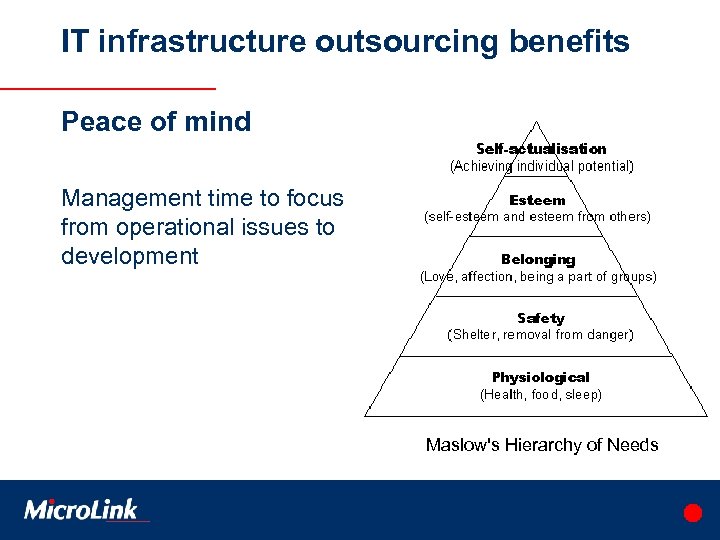 IT infrastructure outsourcing benefits Peace of mind Management time to focus from operational issues to development Maslow's Hierarchy of Needs