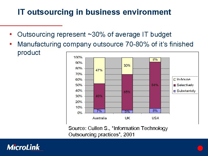 IT outsourcing in business environment • Outsourcing represent ~30% of average IT budget • Manufacturing company outsource 70 -80% of it’s finished product Source: Cullen S. , “Information Technology Outsourcing practices”, 2001
