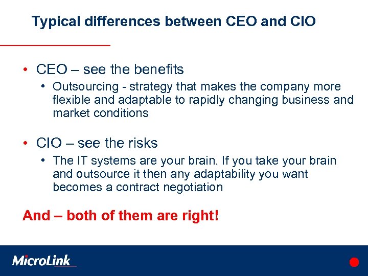 Typical differences between CEO and CIO • CEO – see the benefits • Outsourcing - strategy that makes the company more flexible and adaptable to rapidly changing business and market conditions • CIO – see the risks • The IT systems are your brain. If you take your brain and outsource it then any adaptability you want becomes a contract negotiation And – both of them are right!