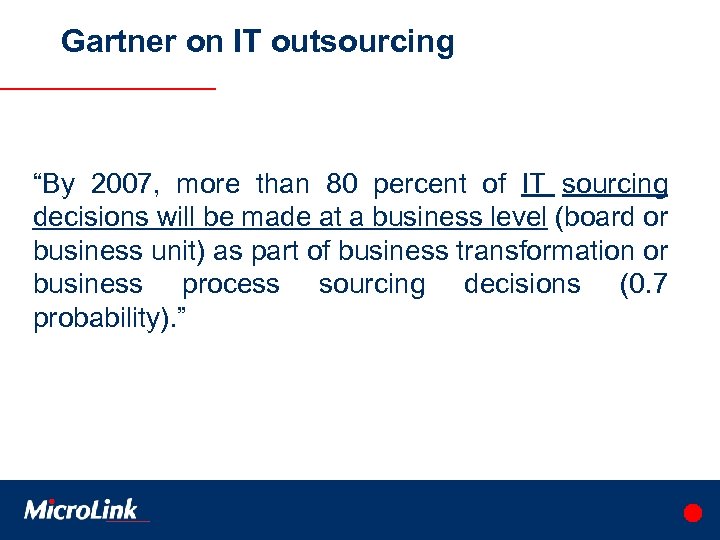 Gartner on IT outsourcing “By 2007, more than 80 percent of IT sourcing decisions will be made at a business level (board or business unit) as part of business transformation or business process sourcing decisions (0. 7 probability). ”