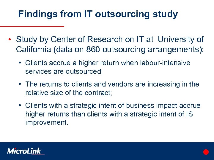 Findings from IT outsourcing study • Study by Center of Research on IT at University of California (data on 860 outsourcing arrangements): • Clients accrue a higher return when labour-intensive services are outsourced; • The returns to clients and vendors are increasing in the relative size of the contract; • Clients with a strategic intent of business impact accrue higher returns than clients with a strategic intent of IS improvement.