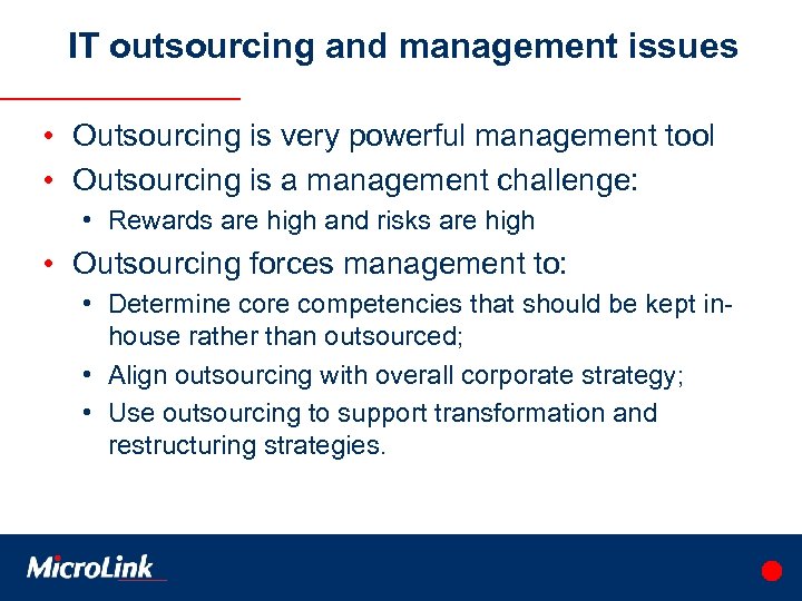 IT outsourcing and management issues • Outsourcing is very powerful management tool • Outsourcing is a management challenge: • Rewards are high and risks are high • Outsourcing forces management to: • Determine core competencies that should be kept inhouse rather than outsourced; • Align outsourcing with overall corporate strategy; • Use outsourcing to support transformation and restructuring strategies.