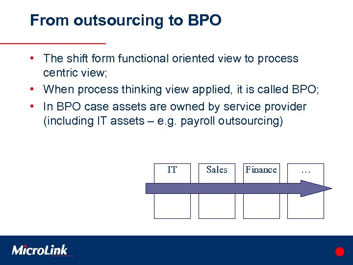 From outsourcing to BPO • The shift form functional oriented view to process centric view; • When process thinking view applied, it is called BPO; • In BPO case assets are owned by service provider (including IT assets – e. g. payroll outsourcing) IT Sales Finance …