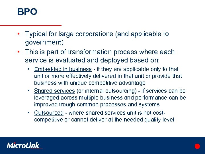 BPO • Typical for large corporations (and applicable to government) • This is part of transformation process where each service is evaluated and deployed based on: • Embedded in business - if they are applicable only to that unit or more effectively delivered in that unit or provide that business with unique competitive advantage • Shared services (or internal outsourcing) - if services can be leveraged across multiple business and performance can be improved trough common processes and systems • Outsourced - where shared services unit is not costcompetitive or cannot deliver at the needed quality level