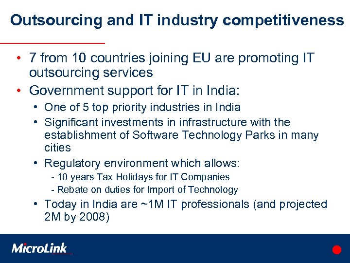 Outsourcing and IT industry competitiveness • 7 from 10 countries joining EU are promoting IT outsourcing services • Government support for IT in India: • One of 5 top priority industries in India • Significant investments in infrastructure with the establishment of Software Technology Parks in many cities • Regulatory environment which allows: - 10 years Tax Holidays for IT Companies - Rebate on duties for Import of Technology • Today in India are ~1 M IT professionals (and projected 2 M by 2008)