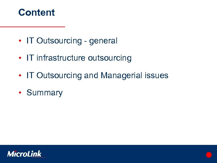 Content • IT Outsourcing - general • IT infrastructure outsourcing • IT Outsourcing and Managerial issues • Summary