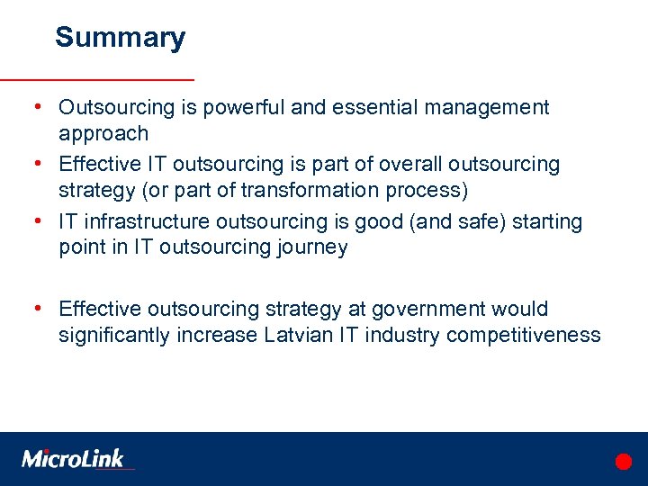 Summary • Outsourcing is powerful and essential management approach • Effective IT outsourcing is part of overall outsourcing strategy (or part of transformation process) • IT infrastructure outsourcing is good (and safe) starting point in IT outsourcing journey • Effective outsourcing strategy at government would significantly increase Latvian IT industry competitiveness