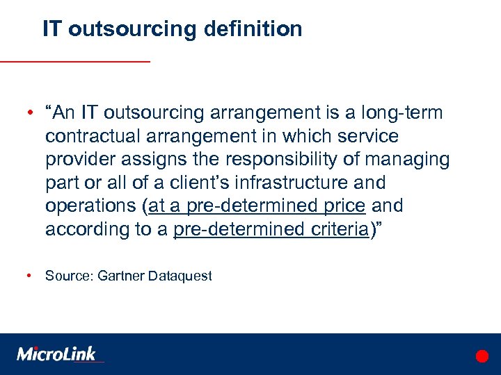 IT outsourcing definition • “An IT outsourcing arrangement is a long-term contractual arrangement in which service provider assigns the responsibility of managing part or all of a client’s infrastructure and operations (at a pre-determined price and according to a pre-determined criteria)” • Source: Gartner Dataquest