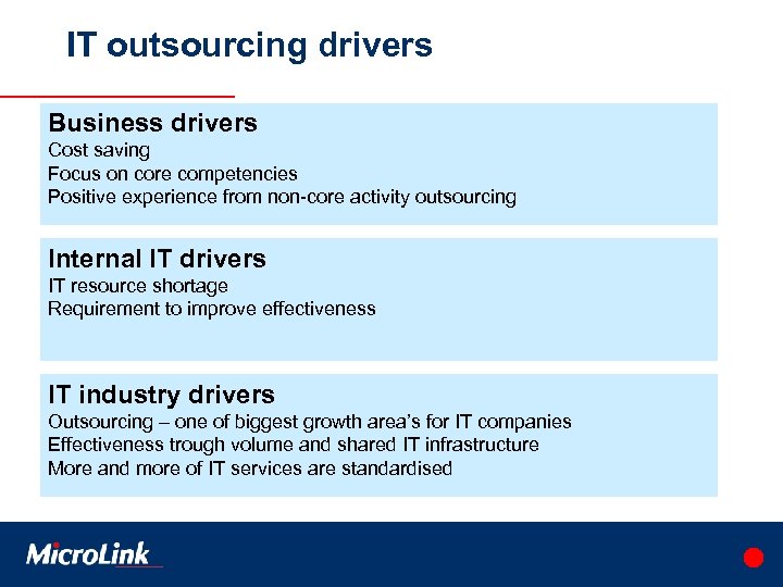 IT outsourcing drivers Business drivers Cost saving Focus on core competencies Positive experience from non-core activity outsourcing Internal IT drivers IT resource shortage Requirement to improve effectiveness IT industry drivers Outsourcing – one of biggest growth area’s for IT companies Effectiveness trough volume and shared IT infrastructure More and more of IT services are standardised