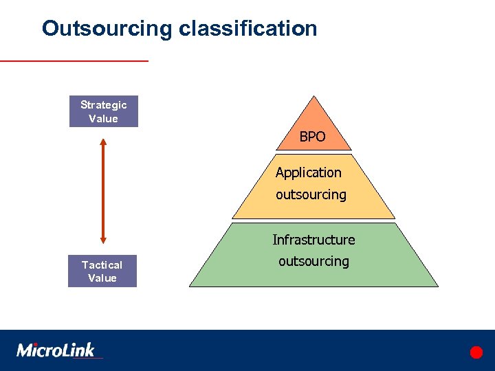 Outsourcing classification Strategic Value BPO Application outsourcing Infrastructure Tactical Value outsourcing