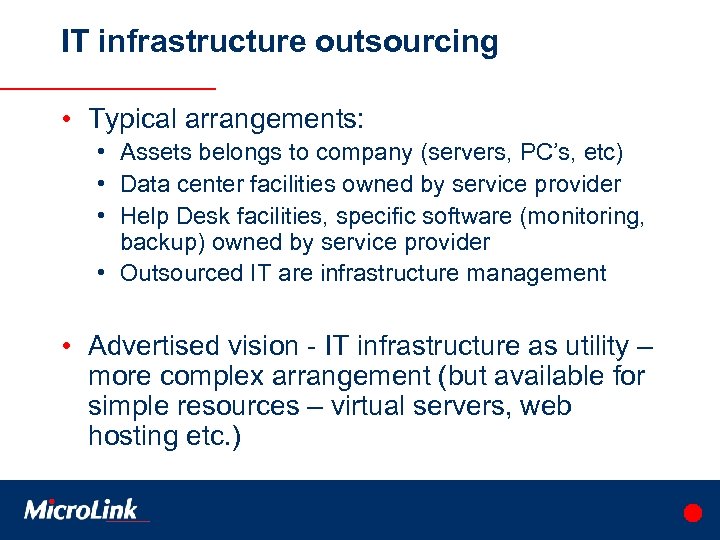 IT infrastructure outsourcing • Typical arrangements: • Assets belongs to company (servers, PC’s, etc) • Data center facilities owned by service provider • Help Desk facilities, specific software (monitoring, backup) owned by service provider • Outsourced IT are infrastructure management • Advertised vision - IT infrastructure as utility – more complex arrangement (but available for simple resources – virtual servers, web hosting etc. )