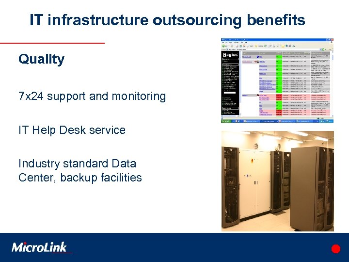 IT infrastructure outsourcing benefits Quality 7 x 24 support and monitoring IT Help Desk service Industry standard Data Center, backup facilities