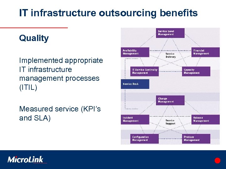 IT infrastructure outsourcing benefits Quality Implemented appropriate IT infrastructure management processes (ITIL) Measured service (KPI’s and SLA)