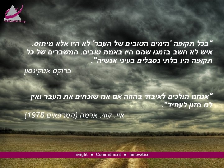 "בכל תקופה 'הימים הטובים של העבר' לא היו אלא מיתוס. איש לא חשב בזמנו שהם היו באמת טובים. המשברים של כל תקופה היו בלתי נסבלים בעיני אנשיה". ברוקס אטקינסון "אנחנו הולכים לאיבוד בהווה אם אנו שוכחים את העבר ואין לנו חזון לעתיד". איי. קווי. ארמה )המרפאים 8791(