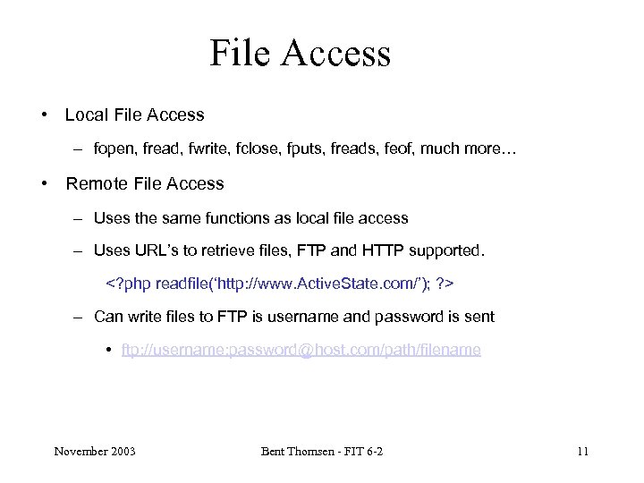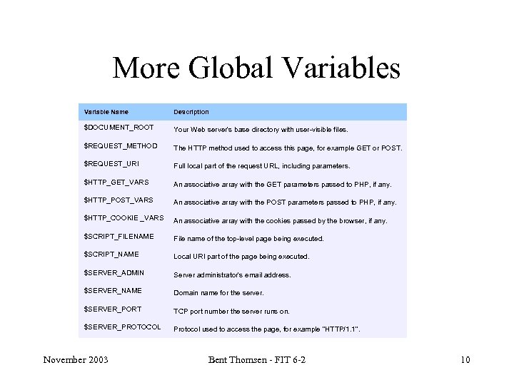 More Global Variables Variable Name Description $DOCUMENT_ROOT Your Web server's base directory with user-visible files. $REQUEST_METHOD The HTTP method used to access this page, for example GET or POST. $REQUEST_URI Full local part of the request URL, including parameters. $HTTP_GET_VARS An associative array with the GET parameters passed to PHP, if any. $HTTP_POST_VARS An associative array with the POST parameters passed to PHP, if any. $HTTP_COOKIE _VARS An associative array with the cookies passed by the browser, if any. $SCRIPT_FILENAME File name of the top-level page being executed. $SCRIPT_NAME Local URI part of the page being executed. $SERVER_ADMIN Server administrator's email address. $SERVER_NAME Domain name for the server. $SERVER_PORT TCP port number the server runs on. $SERVER_PROTOCOL Protocol used to access the page, for example "HTTP/1. 1". November 2003 Bent Thomsen - FIT 6 -2 10