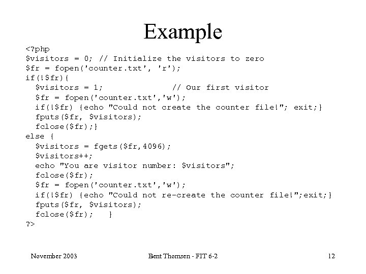 Example <? php $visitors = 0; // Initialize the visitors to zero $fr = fopen('counter. txt', 'r'); if(!$fr){ $visitors = 1; // Our first visitor $fr = fopen('counter. txt', 'w'); if(!$fr) {echo "Could not create the counter file!"; exit; } fputs($fr, $visitors); fclose($fr); } else { $visitors = fgets($fr, 4096); $visitors++; echo "You are visitor number: $visitors"; fclose($fr); $fr = fopen('counter. txt', 'w'); if(!$fr) {echo "Could not re-create the counter file!"; exit; } fputs($fr, $visitors); fclose($fr); } ? > November 2003 Bent Thomsen - FIT 6 -2 12