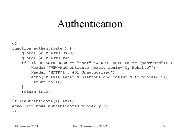 Authentication <? function authenticate() { global $PHP_AUTH_USER; global $PHP_AUTH_PW; if(!($PHP_AUTH_USER == “user" && $PHP_AUTH_PW == “password“)) { Header(‘WWW-Authenticate: basic realm=“My Website“’); Header(‘HTTP/1. 0 401 Unauthorized’); echo(‘Please enter a username and password to proceed. ’); return false; } return true; } if (!authenticate()) exit; echo “You have authenticated properly!”; ? > November 2003 Bent Thomsen - FIT 6 -2 13