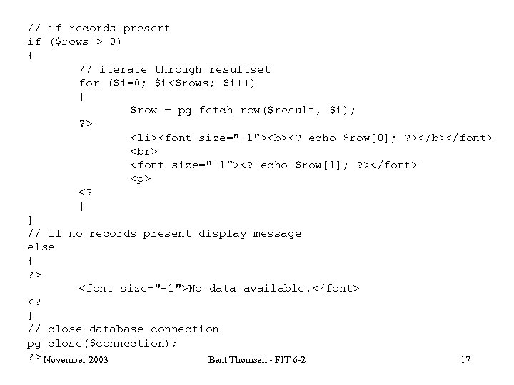 // if records present if ($rows > 0) { // iterate through resultset for ($i=0; $i<$rows; $i++) { $row = pg_fetch_row($result, $i); ? > <li><font size="-1"><b><? echo $row[0]; ? ></b></font> <font size="-1"><? echo $row[1]; ? ></font> <p> <? } } // if no records present display message else { ? > <font size="-1">No data available. </font> <? } // close database connection pg_close($connection); ? > November 2003 Bent Thomsen - FIT 6 -2 17