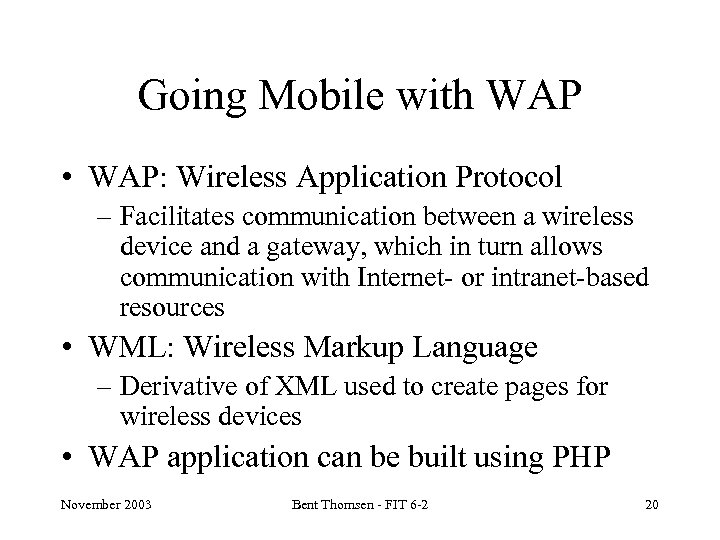 Going Mobile with WAP • WAP: Wireless Application Protocol – Facilitates communication between a wireless device and a gateway, which in turn allows communication with Internet- or intranet-based resources • WML: Wireless Markup Language – Derivative of XML used to create pages for wireless devices • WAP application can be built using PHP November 2003 Bent Thomsen - FIT 6 -2 20