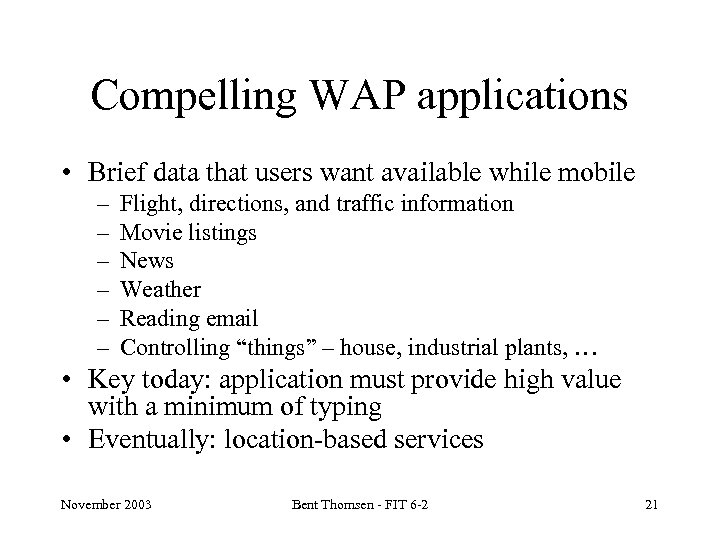 Compelling WAP applications • Brief data that users want available while mobile – – – Flight, directions, and traffic information Movie listings News Weather Reading email Controlling “things” – house, industrial plants, … • Key today: application must provide high value with a minimum of typing • Eventually: location-based services November 2003 Bent Thomsen - FIT 6 -2 21