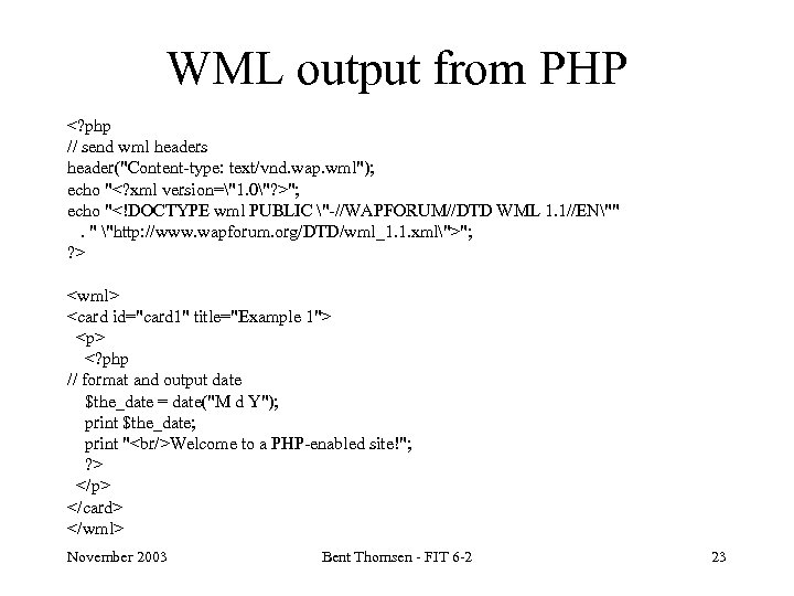 WML output from PHP <? php // send wml headers header("Content-type: text/vnd. wap. wml"); echo "<? xml version="1. 0"? >"; echo "<!DOCTYPE wml PUBLIC "-//WAPFORUM//DTD WML 1. 1//EN"". " "http: //www. wapforum. org/DTD/wml_1. 1. xml">"; ? > <wml> <card id="card 1" title="Example 1"> <p> <? php // format and output date $the_date = date("M d Y"); print $the_date; print "<br/>Welcome to a PHP-enabled site!"; ? > </p> </card> </wml> November 2003 Bent Thomsen - FIT 6 -2 23