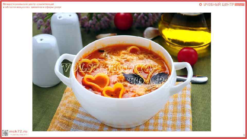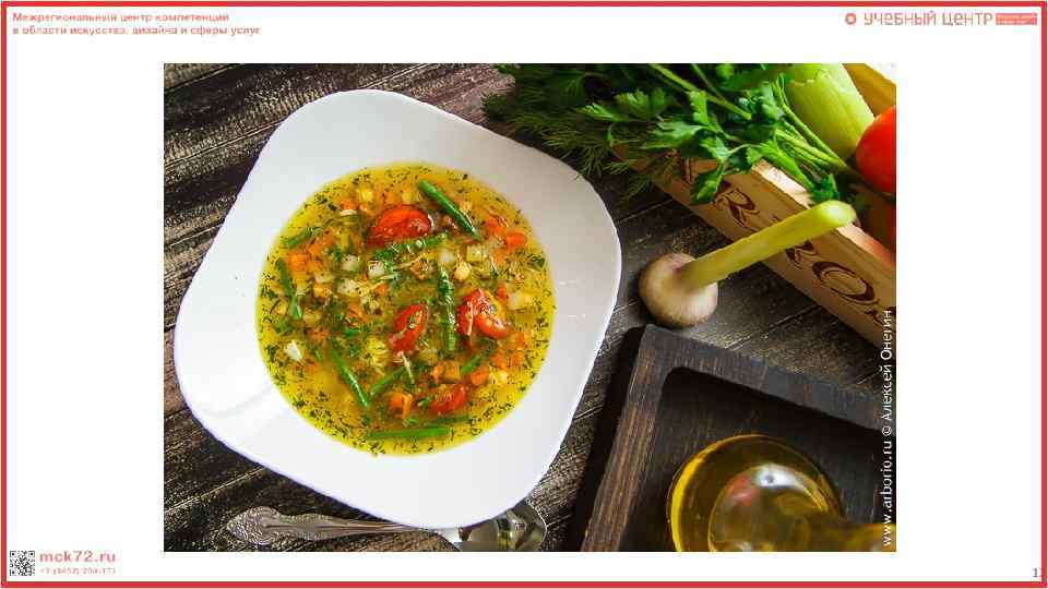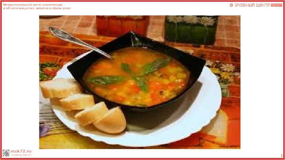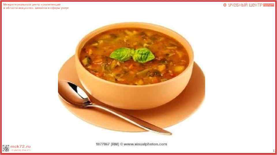 Контроль качества Суп «Минестроне» Наименование показателей Требования к качеству Возможные дефекты Способы устранения Внешний вид бульон красного цвета с овощами и кусочками свиной грудинки, сверху посыпан сыром Недостаточное количество продуктов в порции супа ( или отсутствие какого либо компонента) При подаче следить за тем чтоб все ингредиенты присутствовали в порции супа Цвет Красно-оранжевый Недостаток цвета в бульоне Добавление большего количества помидоров Консистенция овощи сохранили форму 1) Сильно густая / сильно нарезки, мягкие, проваренные. жидкая. 2) Овощи потеряли форму нарезки 1)Уменьшение или увеличение количества продуктов. 2) Уменьшение времени обработки продуктов Запах Копченостей Подгорелых копченостей или овощей Уменьшение длительности обжаривания, уменьшение температуры плиты Вкус Овощей и копченостей 1)Пресный вкус 2) Пересоленный или переперченный вкус 1)Увеличить закладку специй 2) Уменьшить закладку специй