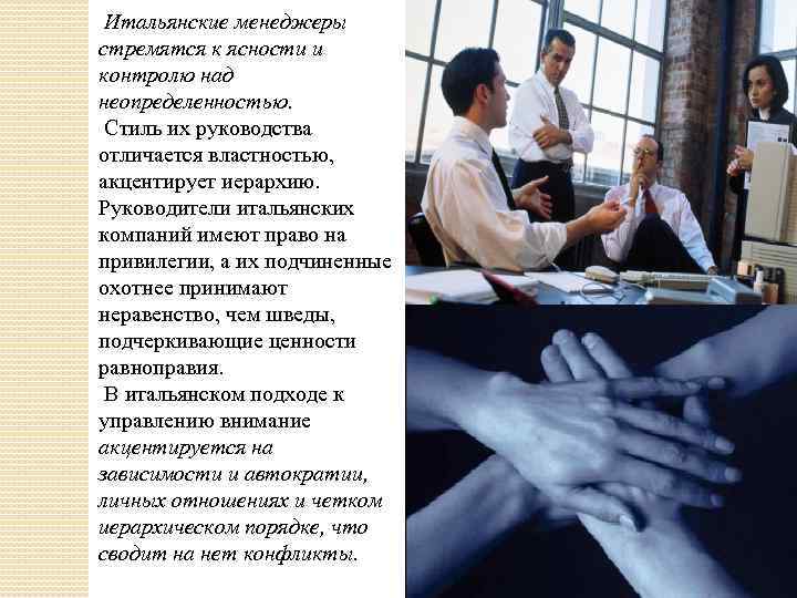 Итальянские менеджеры стремятся к ясности и контролю над неопределенностью. Стиль их руководства отличается властностью, акцентирует иерархию. Руководители итальянских компаний имеют право на привилегии, а их подчиненные охотнее принимают неравенство, чем шведы, подчеркивающие ценности равноправия. В итальянском подходе к управлению внимание акцентируется на зависимости и автократии, личных отношениях и четком иерархическом порядке, что сводит на нет конфликты.