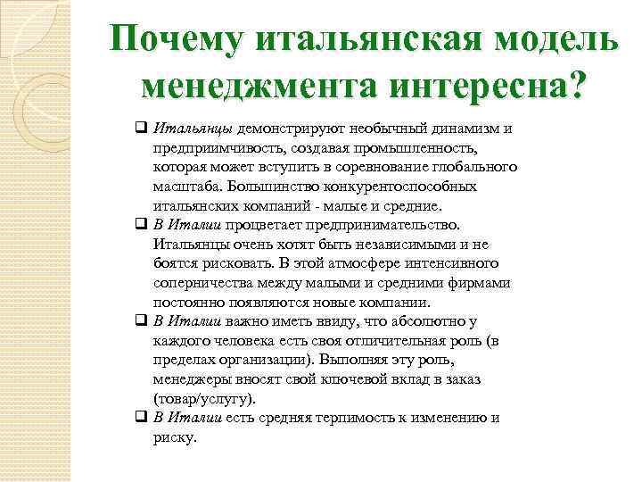 Почему итальянская модель менеджмента интересна? q Итальянцы демонстрируют необычный динамизм и предприимчивость, создавая промышленность, которая может вступить в соревнование глобального масштаба. Большинство конкурентоспособных итальянских компаний - малые и средние. q В Италии процветает предпринимательство. Итальянцы очень хотят быть независимыми и не боятся рисковать. В этой атмосфере интенсивного соперничества между малыми и средними фирмами постоянно появляются новые компании. q В Италии важно иметь ввиду, что абсолютно у каждого человека есть своя отличительная роль (в пределах организации). Выполняя эту роль, менеджеры вносят свой ключевой вклад в заказ (товар/услугу). q В Италии есть средняя терпимость к изменению и риску.