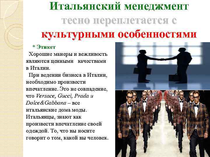 Итальянский менеджмент тесно переплетается с культурными особенностями * Этикет Хорошие манеры и вежливость являются ценными качествами в Италии. При ведении бизнеса в Италии, необходимо произвести впечатление. Это не совпадение, что Versace, Gucci, Prada и Dolce&Gabbana – все итальянские дома моды. Итальянцы, знают как произвести впечатление своей одеждой. То, что вы носите говорит о том, какой вы человек.