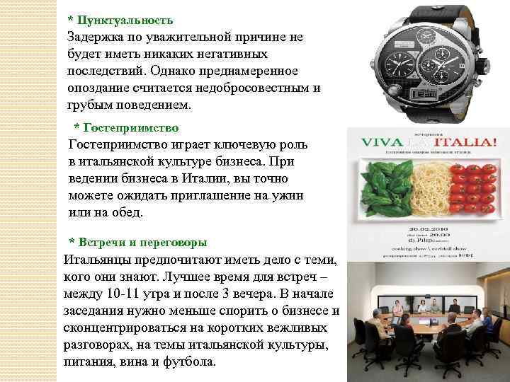 * Пунктуальность Задержка по уважительной причине не будет иметь никаких негативных последствий. Однако преднамеренное опоздание считается недобросовестным и грубым поведением. * Гостеприимство играет ключевую роль в итальянской культуре бизнеса. При ведении бизнеса в Италии, вы точно можете ожидать приглашение на ужин или на обед. * Встречи и переговоры Итальянцы предпочитают иметь дело с теми, кого они знают. Лучшее время для встреч – между 10 -11 утра и после 3 вечера. В начале заседания нужно меньше спорить о бизнесе и сконцентрироваться на коротких вежливых разговорах, на темы итальянской культуры, питания, вина и футбола.